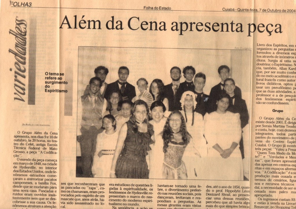 O Grupo de Arte Espírita “Além da Cena” é composto por jovens que freqüentam a mocidade do Centro Espírita Cuiabá e tem como objetivo divulgar a Doutrina Espírita, em seu tríplice aspecto, de maneira lúdica e artística ao mesmo tempo que estreita os laços de amizade dos jovens entre si e de seus compromissos com a Casa e a Causa Espírita.