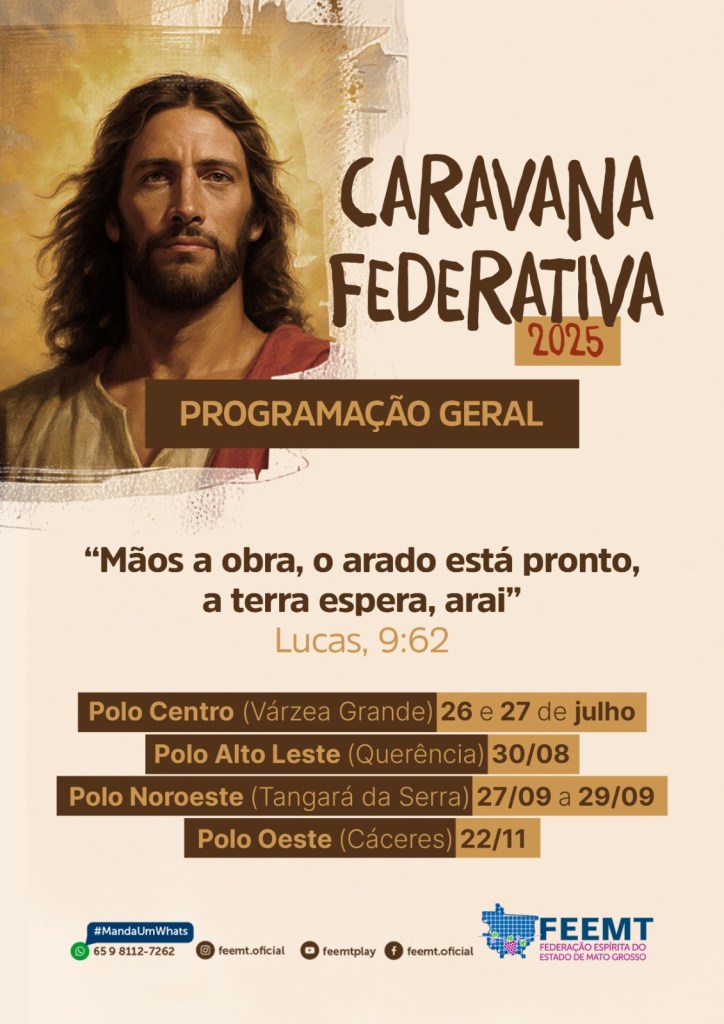 Na segunda-feira, dia 21 de julho às 20h, o ciclo de palestras da Caravana estará no Centro Espírita Cuiabá e quem fará a palestra será a companheira Valéria Lima representando a Federação Espírita de Mato Grosso (FEEMT) com o tema “O Cristo Consolador”.